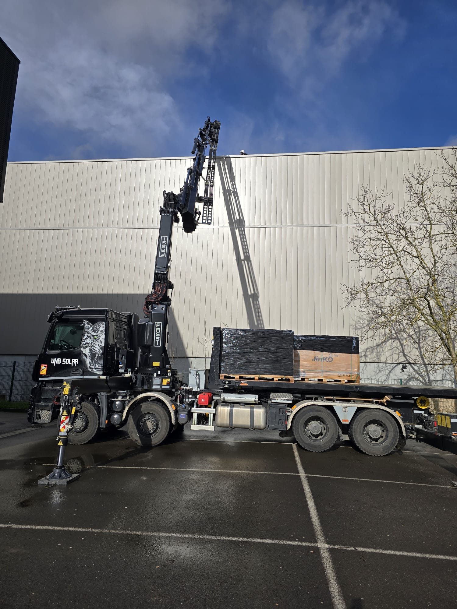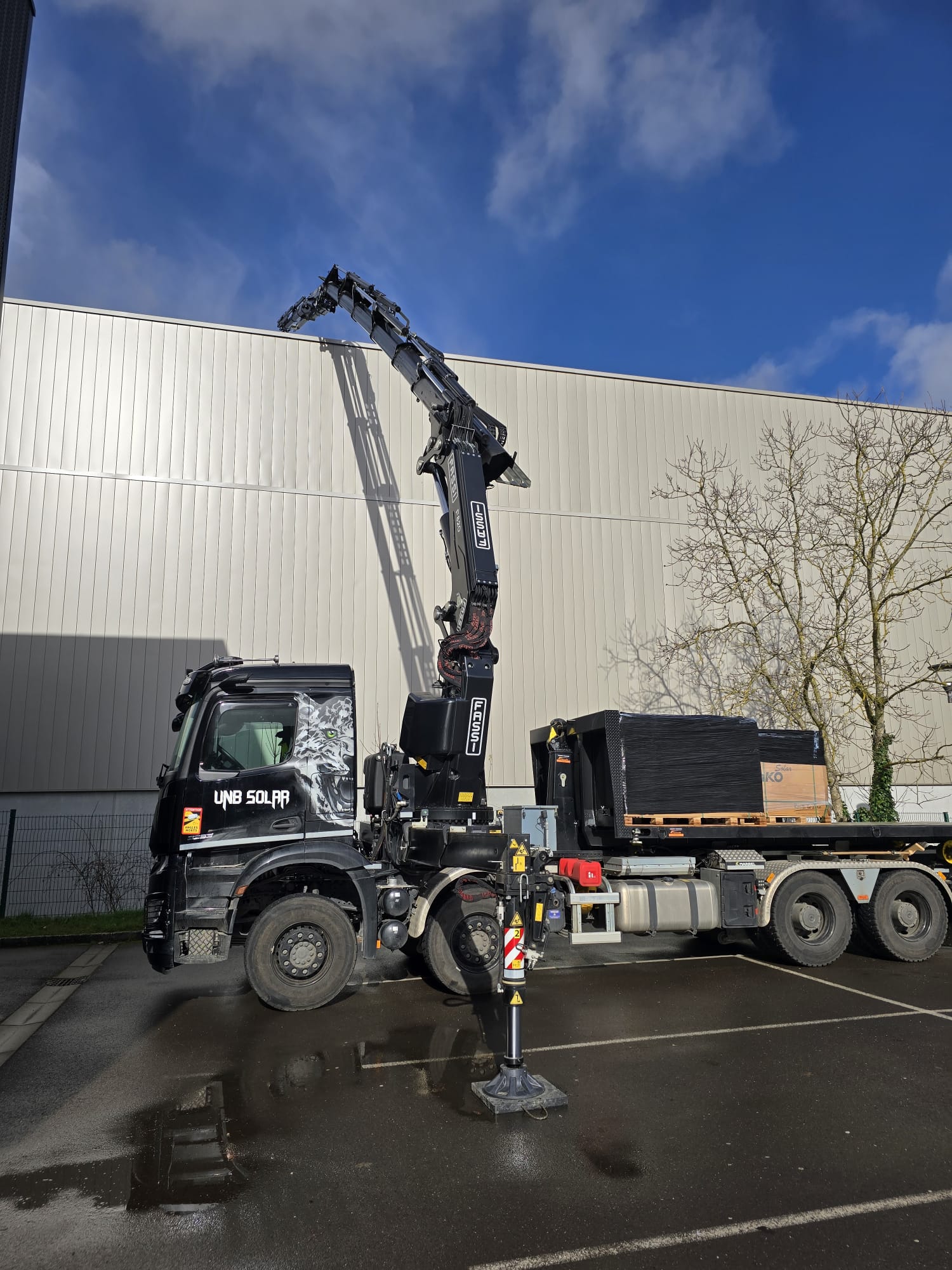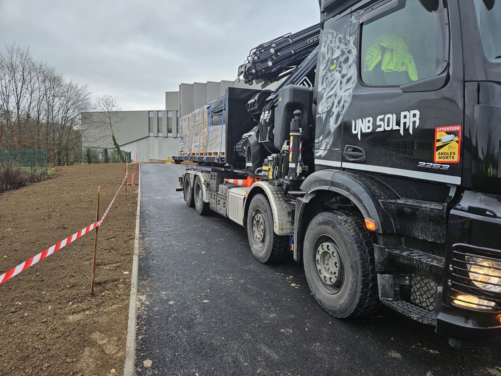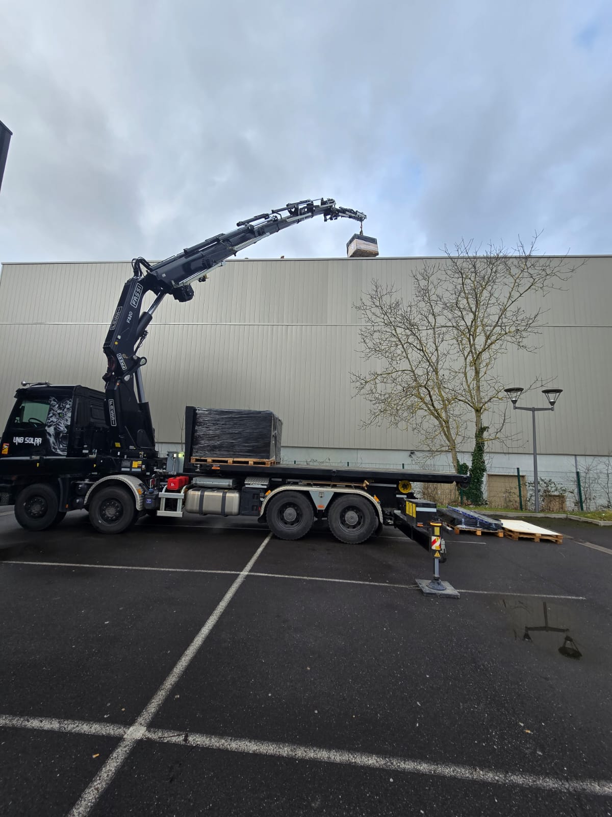 Les modules photovoltaïques, conditionnés sur palettes, ont été acheminés sur site par camion plateau équipé d’une grue auxiliaire de grande portée. En raison des contraintes structurelles de la toiture, il n’était pas possible de déposer les palettes directement sur le toit.