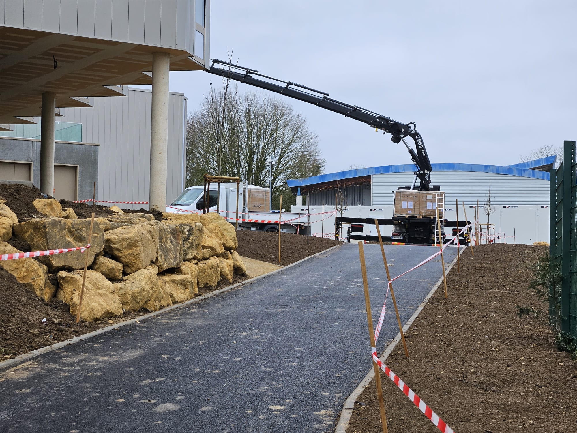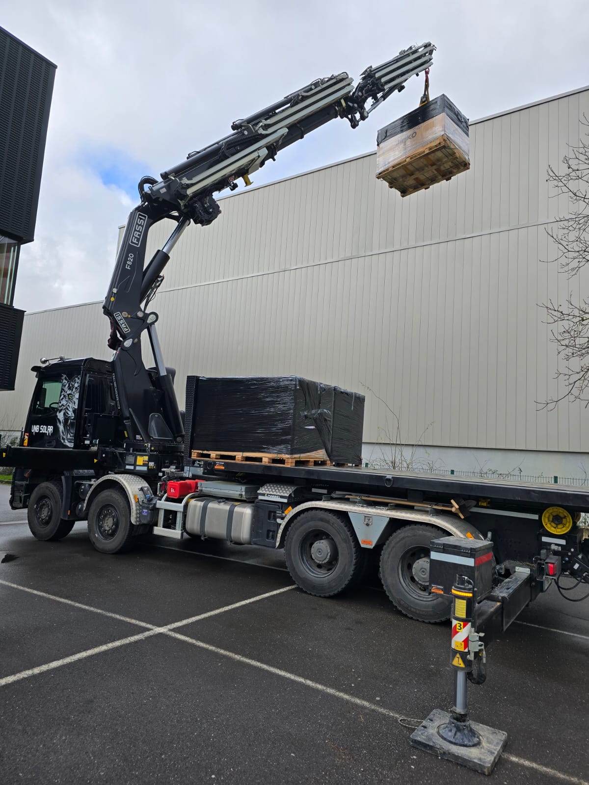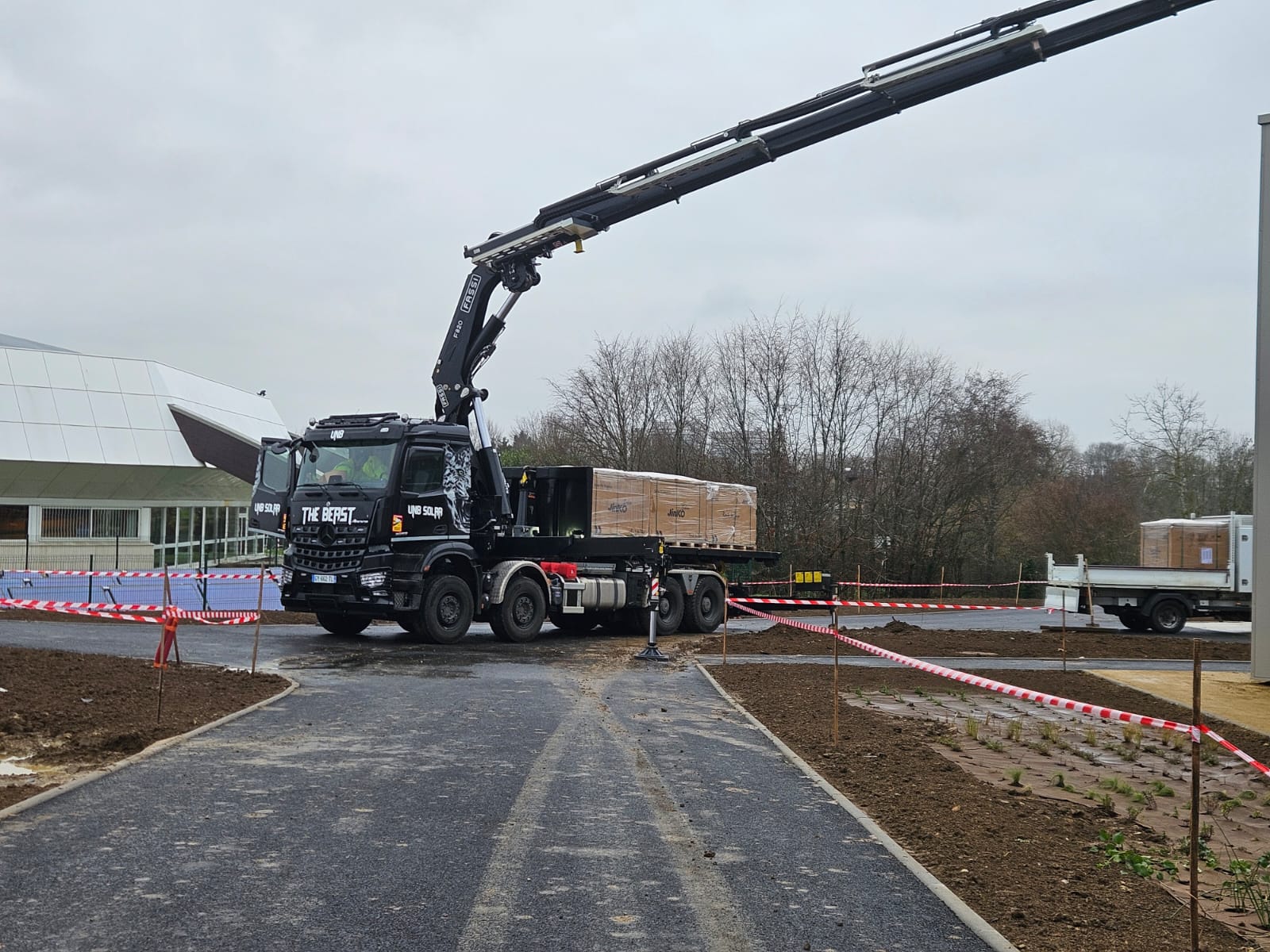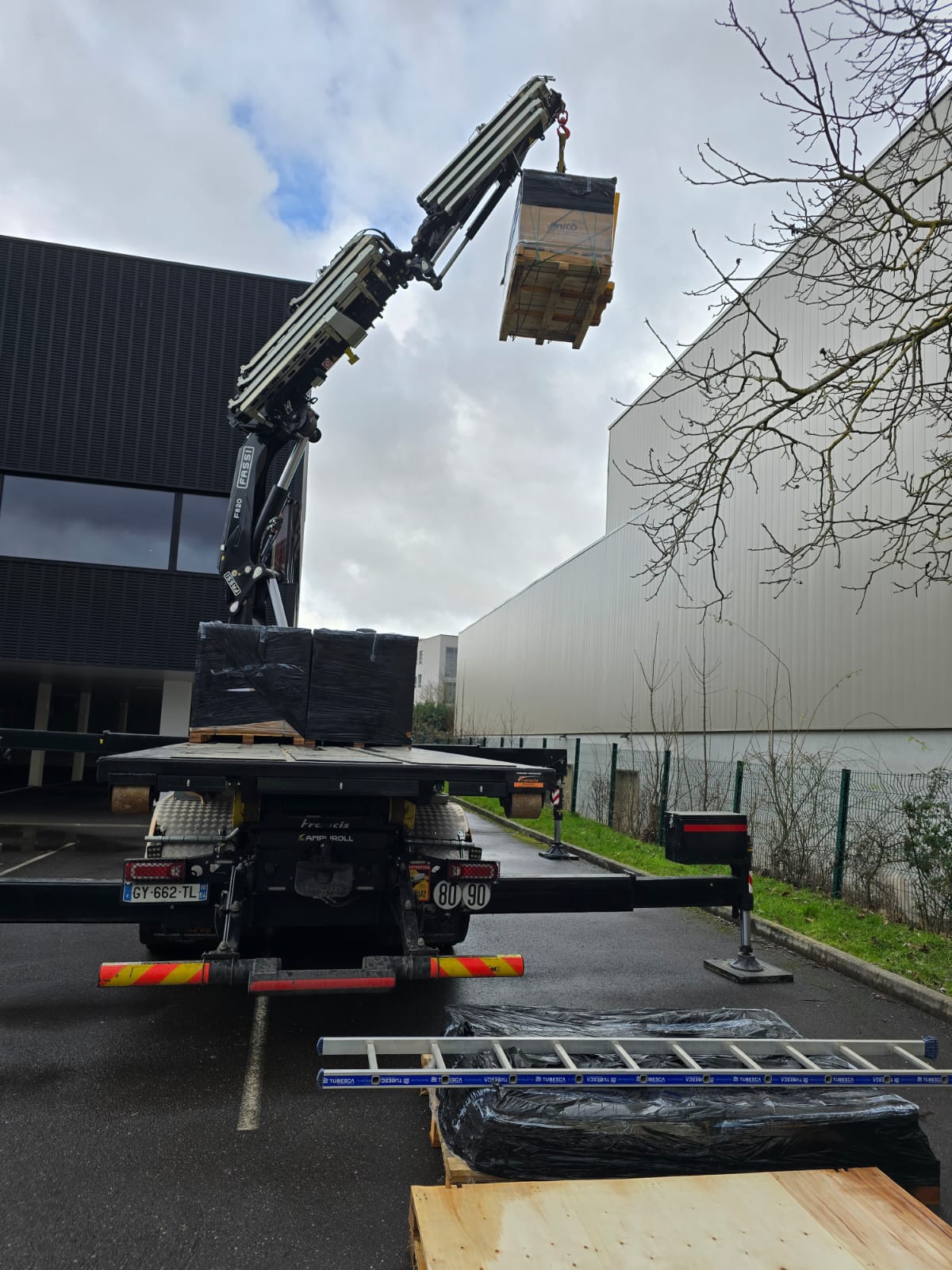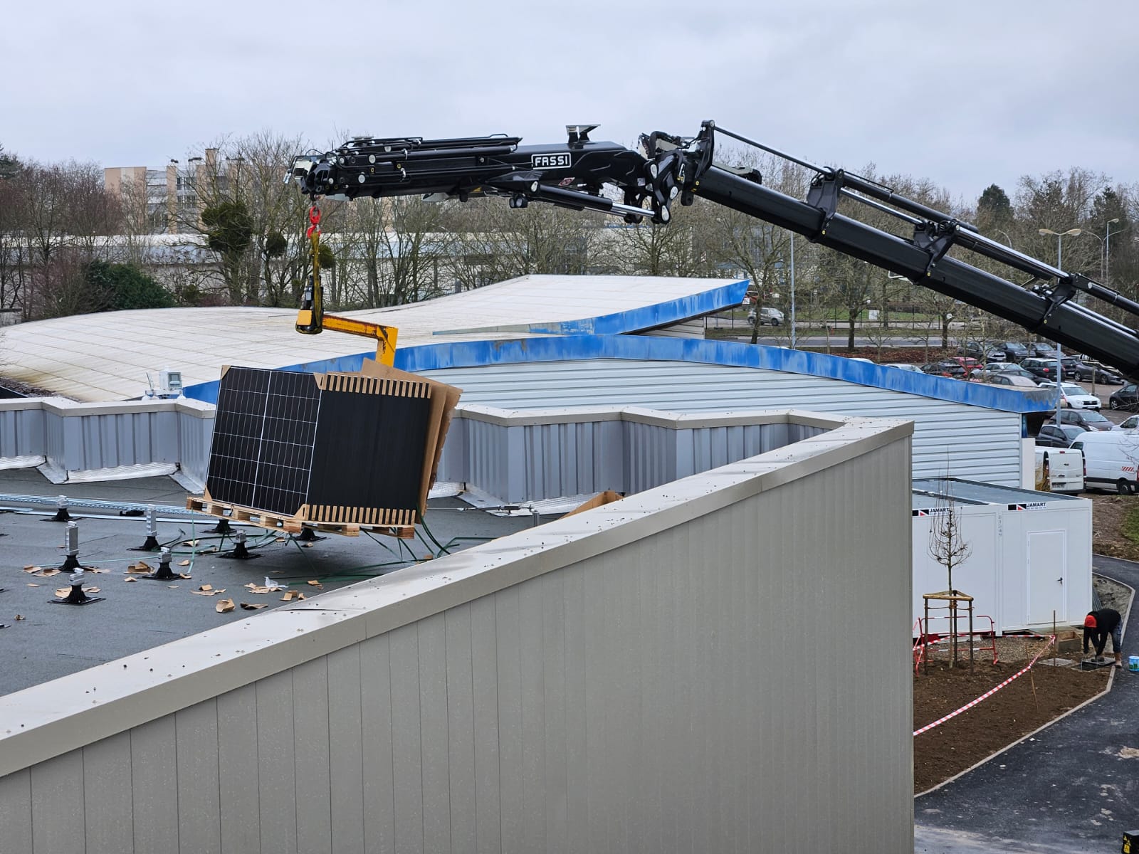 Les modules photovoltaïques, conditionnés sur palettes, ont été acheminés sur site par camion plateau équipé d’une grue auxiliaire de grande portée. En raison des contraintes structurelles de la toiture, il n’était pas possible de déposer les palettes directement sur le toit.