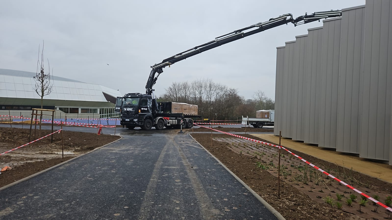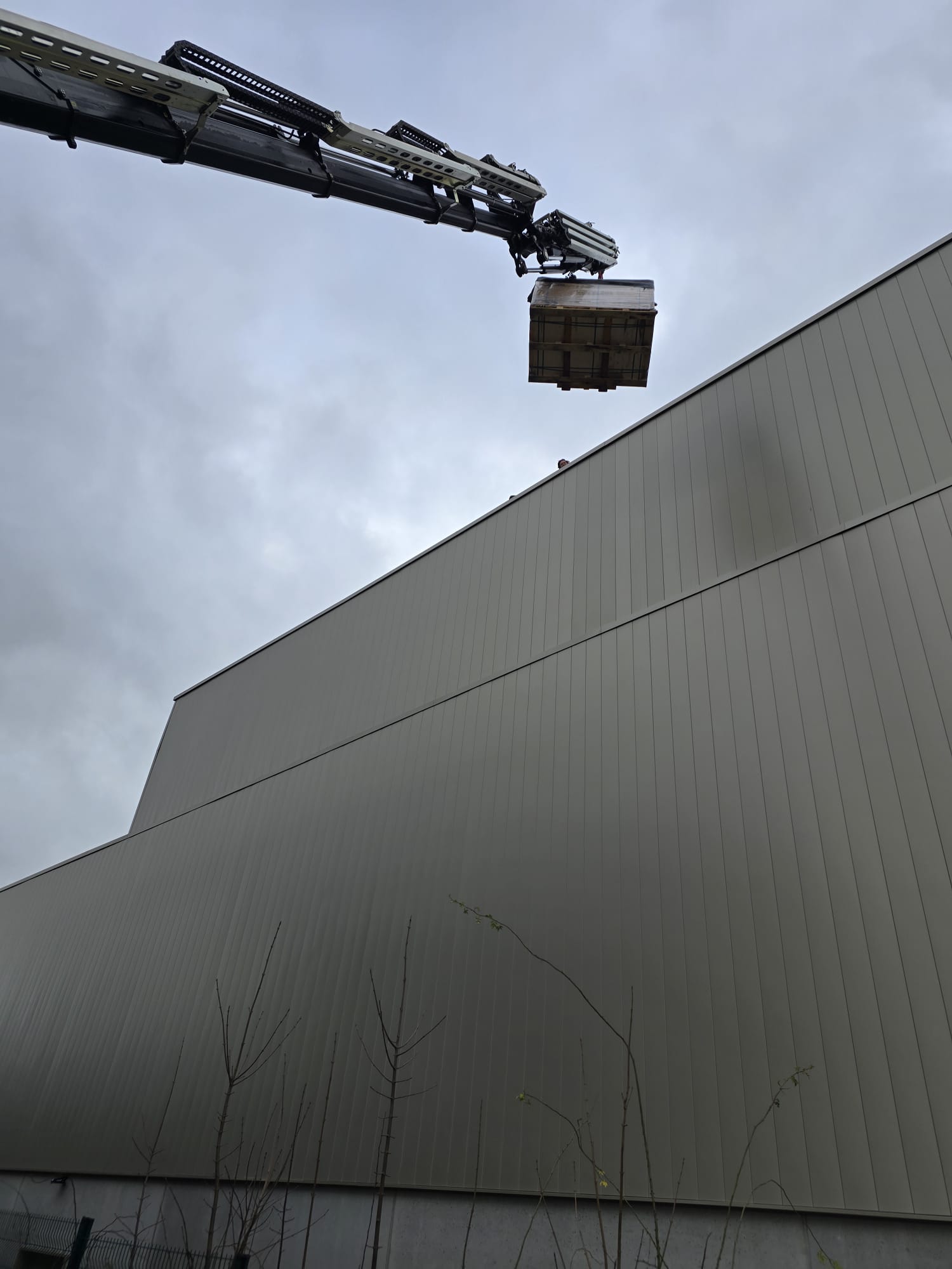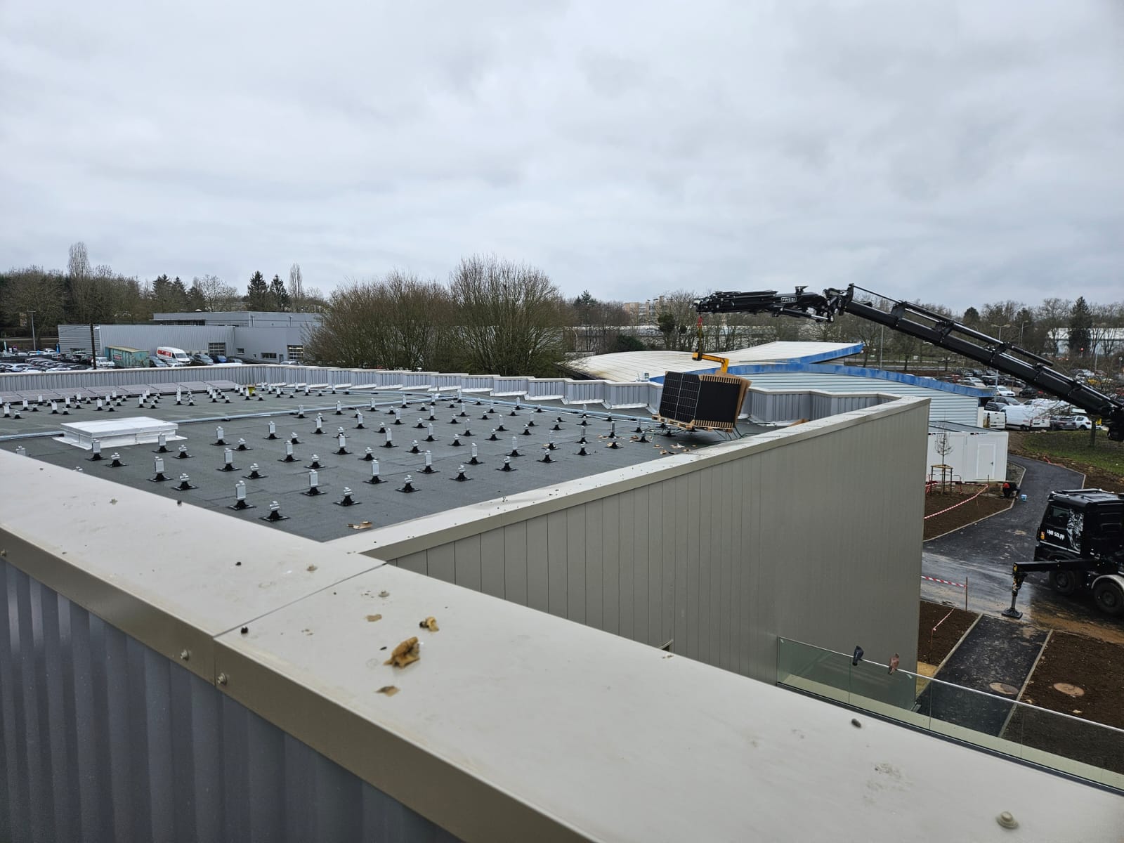 Dans le cadre de la réalisation de cette centrale photovoltaïque à Metz, une étape essentielle du chantier a consisté en la livraison et le levage des panneaux en toiture.